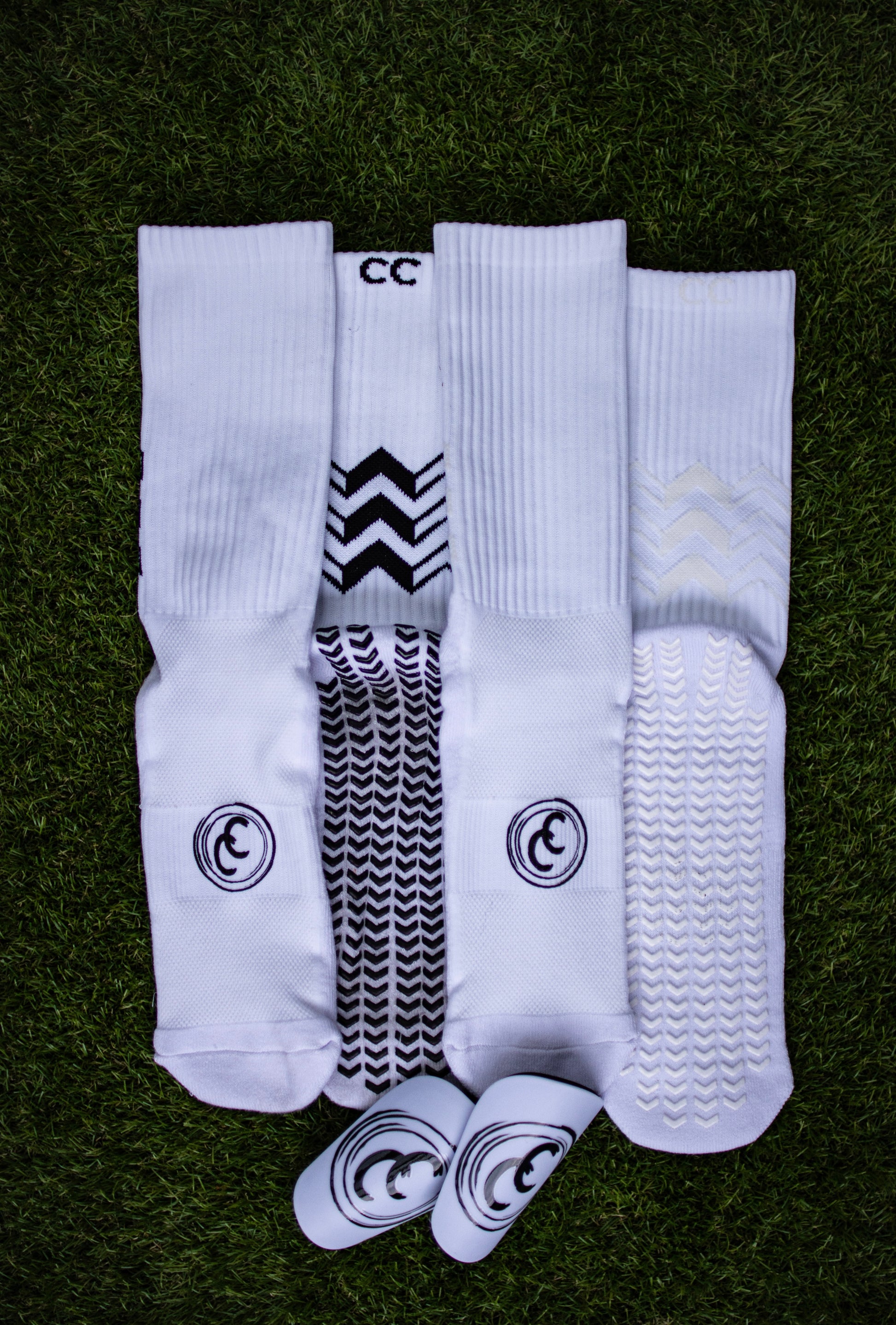 Standard White and Whiteout Grip Socks paired with our White mini shin pad